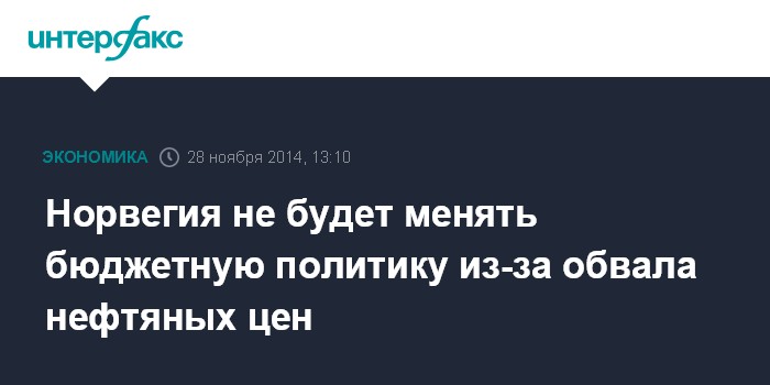 Москва. 28 ноября. INTERFAX.RU – Норвегия, крупнейший производитель нефти среди стран Западной Европы, не намерена менять бюджетную политику и корректировать госрасходы, чтобы отразить сокращение нефтяной выручки из-за обвала цен на мировых рынках, сообщает агентство Bloomberg.
