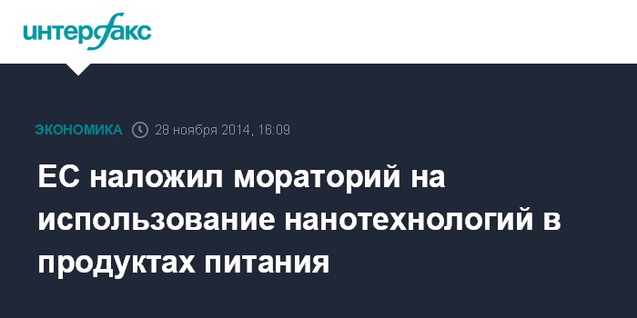 Москва. 28 ноября. INTERFAX.RU - Комитет по проблемам окружающей среды при Европейском парламенте наложил мораторий на использование и продажу в ЕС продуктов питания, произведенных с применением нанотехнологий.