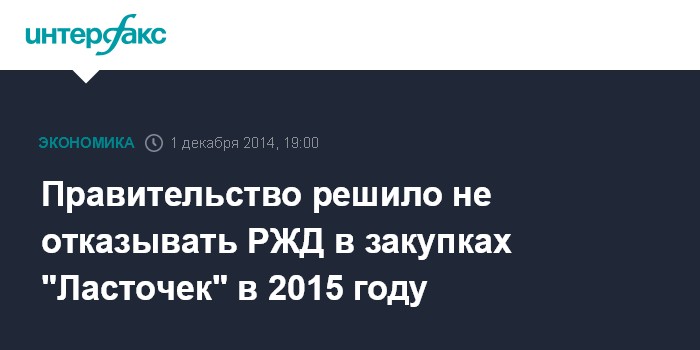 Москва. 1 декабря. INTERFAX.RU - Правительство решило не вносить коррективы в планы РЖД по закупке электропоездов в 2015 году, сообщили "Интерфаксу" несколько источников, знакомых с ходом совещания, состоявшегося по этому поводу у вице-премьера РФ Аркадия Дворковича на минувшей неделе.