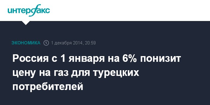 Москва. 1 декабря. INTERFAX.RU - Россия с 1 января снизит на 6% цену на газ для турецких потребителей.