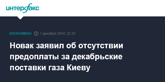 Москва. 1 декабря. INTERFAX.RU - Россия не получала от Украины предоплату за поставки газа в декабре, сообщил журналистам министр энергетики РФ Александр Новак.
