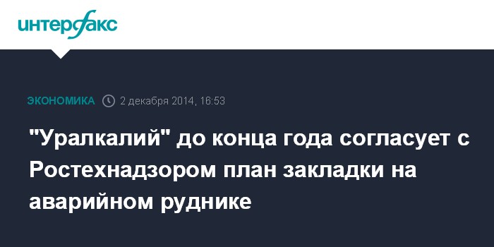 Москва. 2 декабря. INTERFAX.RU - "Уралкалий" рассчитывает до конца года согласовать с Ростехнадзором план по закладке шахтных пустот на аварийном руднике"Соликамск-2", сообщил председатель правительства Пермского края Геннадий Тушнолобов.