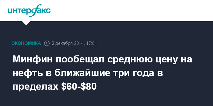 Москва. 2 декабря. INTERFAX.RU - Средняя цена на нефть в ближайшие три года будет колебаться в пределах от $60 за баррель до $80 за баррель, скорее, ближе к верхней границе, считает глава департамента долгосрочного стратегического планирования Минфина РФ Максим Орешкин.