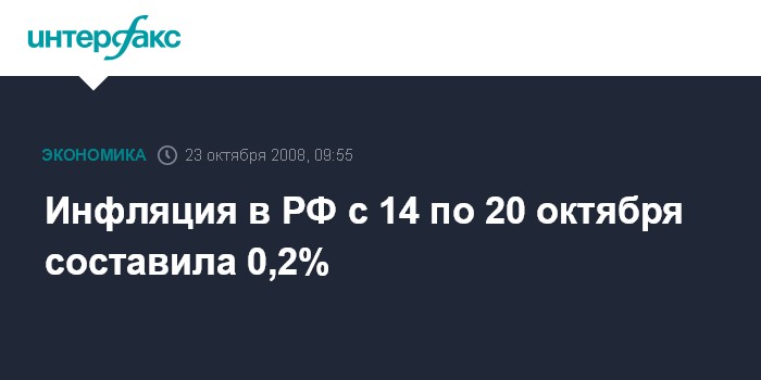 Москва. 23 октября. INTERFAX.RU - Инфляция в России за неделю с 14 по 20 октября составила 0,2%, сообщил "Интерфаксу" источник в одном из ведомств финансово-экономического блока со ссылкой на данные Росстата.