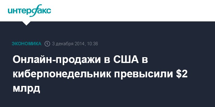 Москва. 3 декабря. INTERFAX.RU - Объем онлайн-продаж в киберпонедельник (1 декабря) в США вырос на 17% - до рекордных $2,04 млрд, свидетельствуют данные исследовательской компании ComScore. Годом ранее рост продаж составил 17,5%.