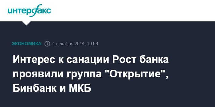 Москва. 4 декабря. INTERFAX.RU – Группа "Открытие", Бинбанк и Московский кредитный банк (МКБ) интересуются участием в санации Рост банка, пишут "Ведомости" со ссылкой на источник, близкий к Рост банку.