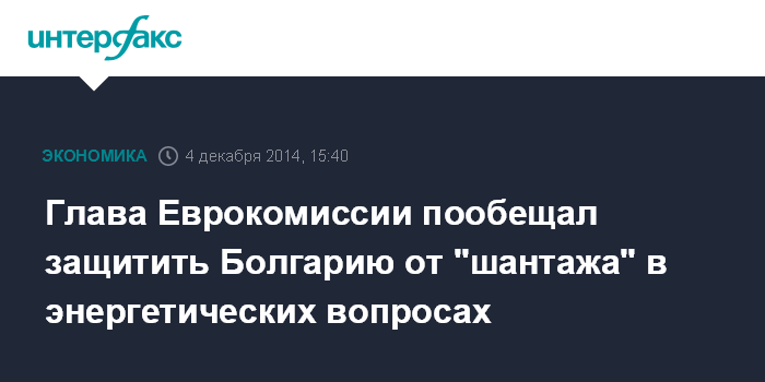Москва. 4 декабря. INTERFAX.RU - Европейская семья поддержит Болгарию в геополитических вызовах и не допустит шантажа в энергетических вопросах, заявил глава Еврокомиссии Жан-Клод Юнкер в четверг в Брюсселе на встрече с премьер-министром Болгарии Бойко Борисовым.