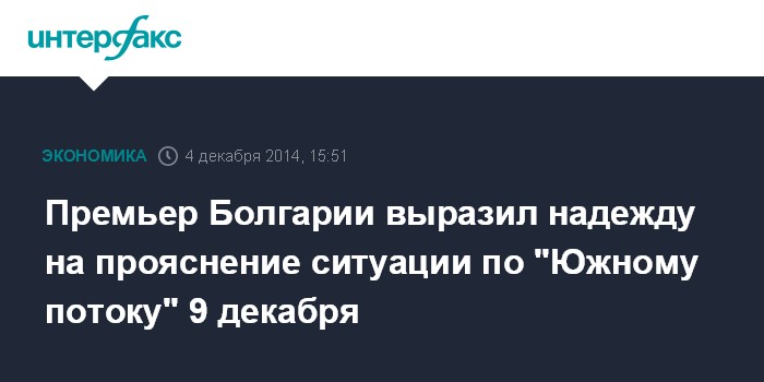 1 декабря президент России Владимир Путин заявил, что Россия останавливает проект строительства газопровода "Южный поток" из-за позиции Болгарии. "С учетом позиции Еврокомиссии, которая не способствует реализации этого проекта... с учетом того, что мы до сих пор не получили разрешение от Болгарии, мы считаем, что Россия в этих условиях не может продолжать реализацию этого проекта", - заявил Путин.