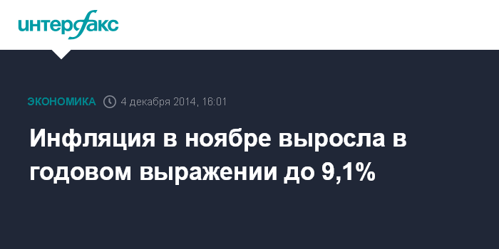 Москва. 4 декабря. INTERFAX.RU - Инфляция в России в ноябре 2014 года ускорилась до 1,3% с 0,8% в октябре. В ноябре прошлого года инфляция составила 0,6%. Инфляция оказалась выше ожиданий аналитиков (консенсус-прогноз экономистов, подготовленный "Интерфаксом", равнялся 1,2%).