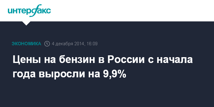 По сравнению с ноябрем 2013 года цены на бензин в ноябре 2014 года повысились на 9,4%. Как сообщалось, в 2013 году бензин подорожал на 5,7% после роста на 6,8% в 2012 году.