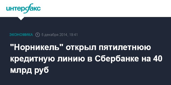 Москва. 5 декабря. INTERFAX.RU - ОАО "ГМК "Норильский никель" открыло кредитную линию в Сбербанке на 40 млрд рублей сроком до декабря 2019 года, сообщила компания.