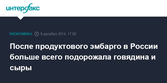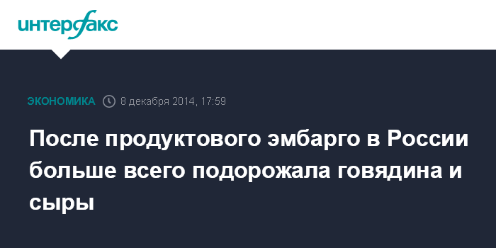 Москва. 8 декабря. INTERFAX.RU - На мясном рынке России средние цены после введенного в августе эмбарго больше всего повысились на говядину, на молочном - на сыры, свидетельствует мониторинг средних цен, который ведет одно из министерств экономического блока.