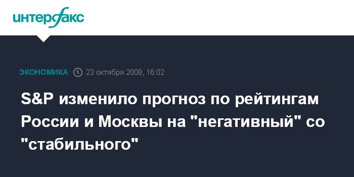 Москва. 23 октября. INTERFAX.RU - Международное рейтинговое агентство Standard & Poor‘s изменило прогноз по рейтингам России на "негативный" со "стабильного", сообщается в пресс-релизе агентства.
