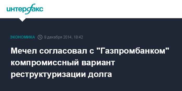 Москва. 9 декабря. INTERFAX.RU - "Мечел" согласовал с "Газпромбанком" "компромиссный" вариант реструктуризации долга, отправил его другим крупнейшим кредиторам-банкам с госучастием - ВТБ и Сбербанку, заявил в ходе телефонной конференции CFO "Мечела" Андрей Сливченко. Он не уточнил деталей.