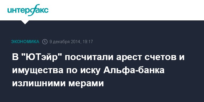 Москва. 9 декабря. INTERFAX.RU - Авиакомпания "ЮТэйр" считает арест счетов и имущества авиаперевозчика в обеспечение иска Альфа-банка излишней мерой, противоречащей судебной практике.