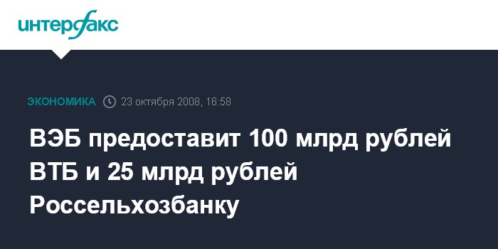 ВЭБ предоставит 100 млрд рублей ВТБ и 25 млрд рублей Россельхозбанку