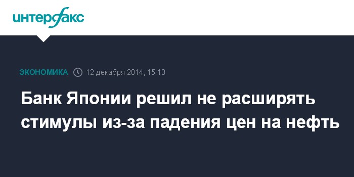Москва. 12 декабря. INTERFAX.RU - Руководство Банка Японии не собирается расширять стимулирование экономики страны в связи с падением мировых цен на нефть, которое способствует снижению инфляции в стране, сообщает агентство Bloomberg со ссылкой на информированные источники.