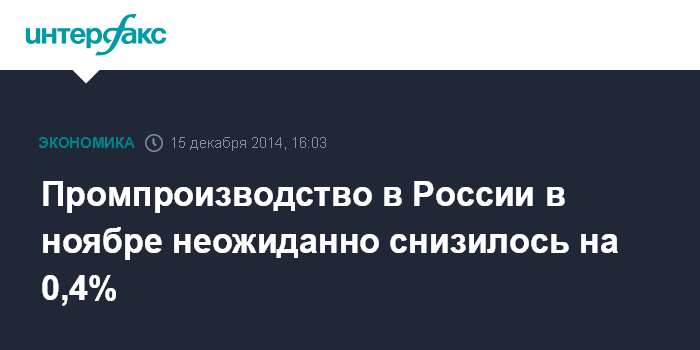 Снижение промпроизводства в ноябре в годовом выражении было зафиксировано впервые с января 2014 года. Снижение в ноябре оказалось неожиданным для экономистов - согласно консенсус-прогнозу, составленному "Интерфаксом", ожидался его рост на 1,5%.
