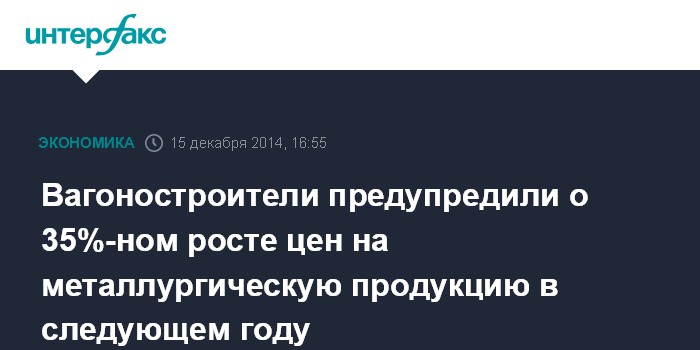 Москва. 15 декабря. INTERFAX.RU – Объединение вагоностроителей (ОВС), в состав которого входят ключевые игроки отрасли в России, заявляет, что металлурги в 2015 году собираются повысить цены на поставляемую продукцию на 35%.