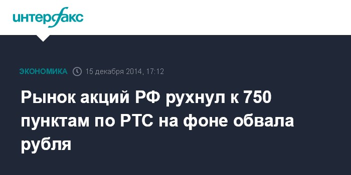 Москва. 15 декабря. INTERFAX.RU - Российский рынок акций в понедельник рухнул в район 750 пунктов по индексу РТС (новый минимум с начала апреля 2009 года) на фоне обвала рубля к бивалютной корзине, рублевый индекс ММВБ также снизился.