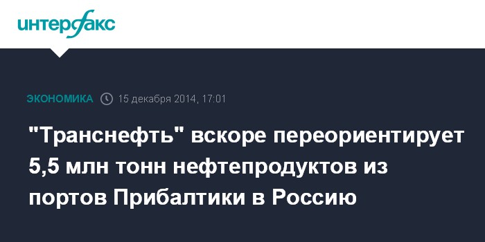 Москва. 15 декабря. INTERFAX.RU - "Транснефть" в ближайшее время приступит к переориентации поставок 5,5 млн тонн нефтепродуктов из прибалтийских портов в порты России, сообщил журналистам президент компании Николай Токарев.