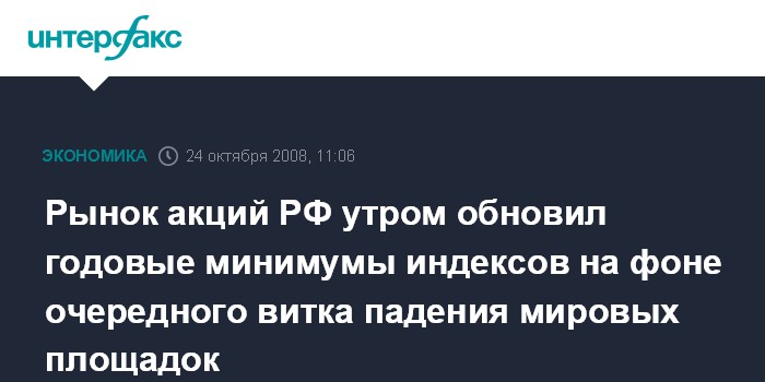 Москва. 24 октября. INTERFAX.RU - Российский рынок акций утром в пятницу обновил минимумы индексов с начала 2008 года на фоне очередного витка падения мировых фондовых площадок и нефти.