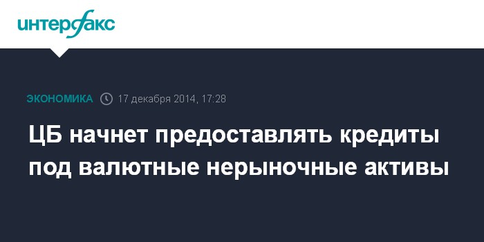 Москва. 17 декабря. INTERFAX.RU - ЦБ начнет предоставление кредитов под валютные нерыночные активы, говорится в заявлении регулятора о мерах по повышению устойчивости финансового сектора.