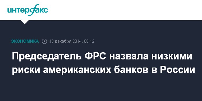 Москва. 17 декабря. INTERFAX.RU - Председатель Федеральной резервной системы (ФРС) Джанет Йеллен считает риски, связанные с происходящим в российской экономике, для США и американских банков сравнительно небольшими.