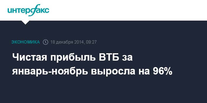 Москва. 18 декабря. INTERFAX.RU – Чистая прибыль банка ВТБ за январь-ноябрь 2014 года составила 81,928 млрд руб. против 41,823 млрд руб. за аналогичный период прошлого года. Таким образом, этот показатель вырос на 96%.