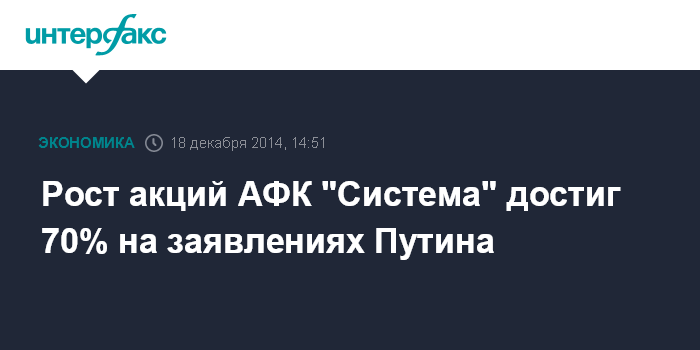 Москва. 18 декабря. INTERFAX.RU - Рост акций АФК "Система" в четверг ускорился после заявлений президента Владимира Путина о том, что следствие не доказало факта легализации в действиях председателя совета директоров АФК "Система" Владимира Евтушенкова при покупке "Башнефти". В этой части обвинения с главы АФК сняты, отметил президент.