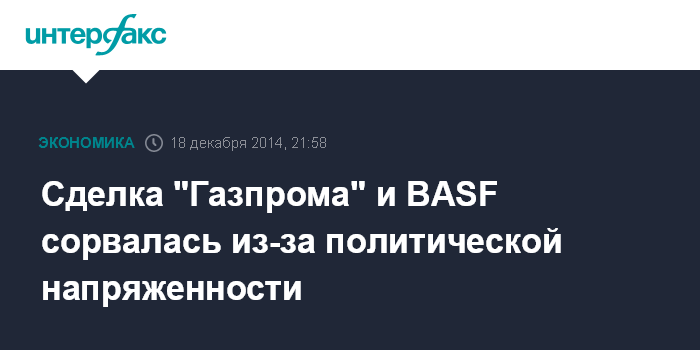 Москва. 18 декабря. INTERFAX.RU - Сделка "Газпрома" и германского концерна BASF по обмену активами не состоялась, говорится в сообщении BASF. "В связи с нынешней напряженной политической обстановкой, BASF и "Газпром" решили не завершать сделку по обмену активами к концу года", - уточнила компания