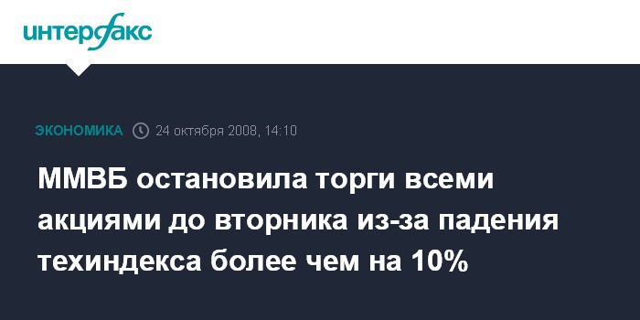 Москва. 24 октября. INTERFAX.RU - Фондовая биржа ММВБ повторно в пятницу остановила торги всеми акциями с 14:10 мск, в этом раз уже до вторника, 28 октября, из-за падения технического индекса биржи более чем на 10% к уровню закрытия предыдущего торгового дня, сообщила биржа.