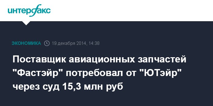 Москва. 19 декабря. INTERFAX.RU - Компания "Фастэйр", которая является поставщиком авиационных запасных частей, обратилась в Арбитражный суд Ханты-Мансийского автономного округа с требованием взыскать с авиакомпании "ЮТэйр" 15,3 млн рублей, следует из карточки дела на сайте суда.