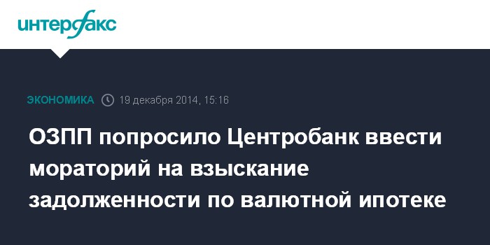 "Предлагаем рассмотреть возможность введения моратория на взыскание просроченной задолженности по валютной ипотеке и распространить его вплоть до периода, когда курс рубля стабилизируется относительно других валют", - говорится в обращении, подписанным председателем ОЗПП Михаилом Аншаковым и размещенном на сайте организации.
