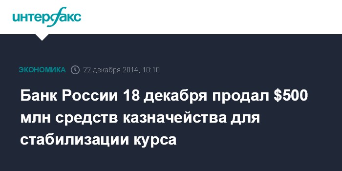 Москва. 22 декабря. INTERFAX.RU - Банк России 18 декабря продал $500 млн для стабилизации курса рубля, свидетельствуют данные на сайте регулятора. Как свидетельствует информация регулятора, речь идет не об интервенциях, а о продаже средств Федерального казначейства.