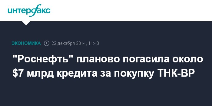 Москва. 22 декабря. INTERFAX.RU – "Роснефть" 22 декабря выплатила группе кредиторов около $7 млрд, привлеченных для финансирования приобретения ТНК-ВР, говорится в сообщении компании.