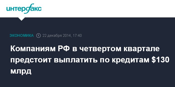Москва. 22 декабря. INTERFAX.RU – Российские компании в четвертом квартале 2014 года должны выплатить кредиты в размере $115-130 млрд, сообщил президент России Владимир Путин.