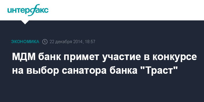 Москва. 22 декабря. INTERFAX.RU - МДМ банк примет участие в конкурсе на выбор санатора банка "Траст", сообщили "Интерфаксу" в пресс-службе МДМ банка со ссылкой на председателя правления кредитного организации Тимура Авдеенко.