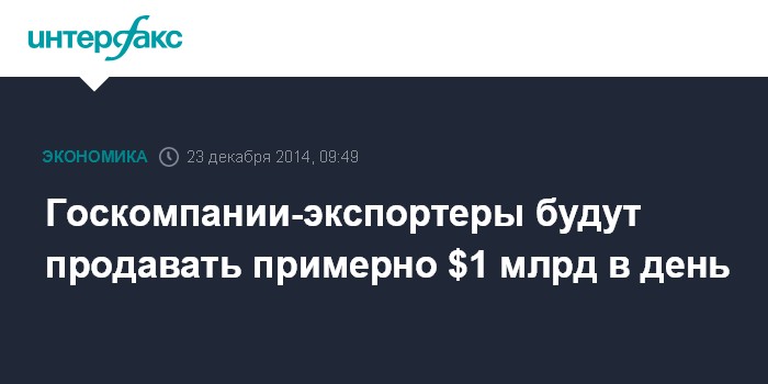 Москва. 23 декабря. INTERFAX.RU – Крупнейшие госкомпании - экспортеры в ближайшие два месяца будут продавать примерно $1 млрд в день по договоренности с властями для стабилизации ситуации на валютном рынке.