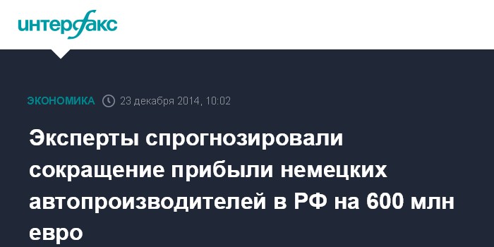Москва. 23 декабря. INTERFAX.RU – Прибыль немецких автопроизводителей на российском рынке уменьшится на 600 млн евро за период до 2017 года из-за снижения спроса, прогнозируют эксперты германского Центра автомобильных исследований CAR.