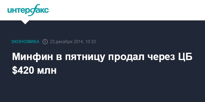 Москва. 23 декабря. INTERFAX.RU – Банк России в пятницу, 19 декабря, продал $420 млн для стабилизации курса рубля, свидетельствуют данные на сайте регулятора.