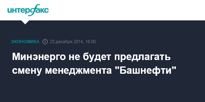 Москва. 23 декабря. INTERFAX.RU - Минэнерго не предлагает смену менеджмента "Башнефти", которая недавно перешла из частной собственности в государственную, заявил журналистам глава министерства Александр Новак.