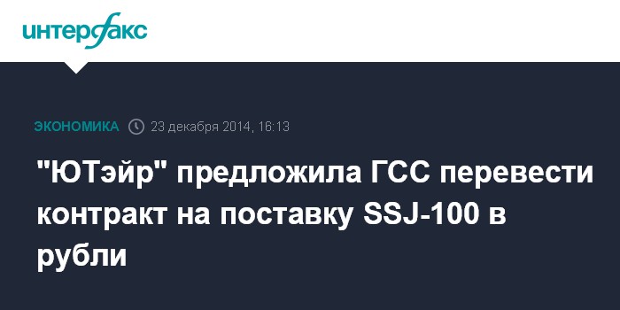 Москва. 23 декабря. INTERFAX.RU – Авиакомпания "ЮТэйр" предлагает ЗАО "Гражданские самолеты Сухого" (ГСС) внести корректировки в контракт на поставку самолетов SSJ-100, а именно: зафиксировать контракт в рублях, сообщил "Интерфаксу" источник, близкий к переговорам.