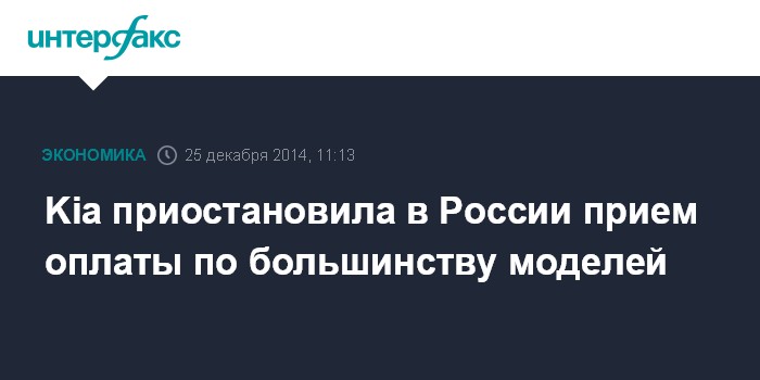 Москва. 25 декабря. INTERFAX.RU - Российское подразделение корейского автопроизводителя Kia Motors - Kia Motors Rus - временно приостановило прием оплаты за отгруженные дилерам автомобили вплоть до конца 2014 года, либо иного официально объявленного срока.