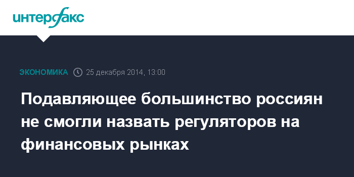 Москва. 25 декабря. INTERFAX.RU – Подавляющее большинство россиян не знают, кто регулирует деятельность компаний на рынках финансовых услуг, свидетельствуют результаты опроса Национального агентства финансовых исследований (НАФИ), проведенного в декабре 2014 года.
