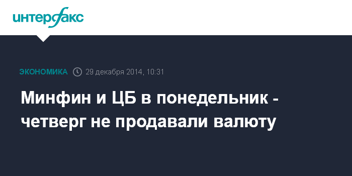 Москва. 29 декабря. INTERFAX.RU - Министерство финансов и Банк России в понедельник - четверг на прошлой неделе воздерживались от продажи валюты.