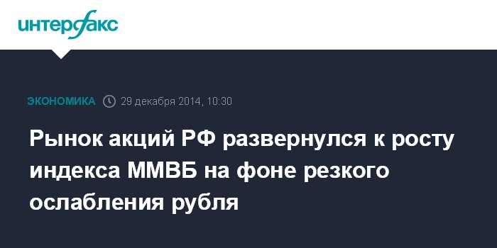 Москва. 29 декабря. INTERFAX.RU - Рынок акций РФ утром в понедельник после негативного открытия развернулся к росту по индексу ММВБ из-за резкого ослабления рубля, что оказывает поддержку рублевым ценам бумаг.