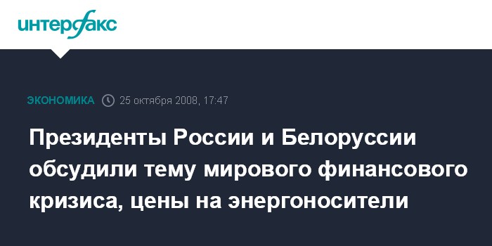 Президенты России и Белоруссии обсудили тему мирового финансового кризиса, цены на энергоносители