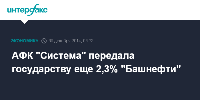 Москва. 30 декабря. INTERFAX.RU - АФК "Система" передала Росимуществу 2,3% уставного капитала ОАО АНК "Башнефть" (4 млн 107 тыс. 996 обыкновенных и 87 тыс. 831 привилегированную акцию).