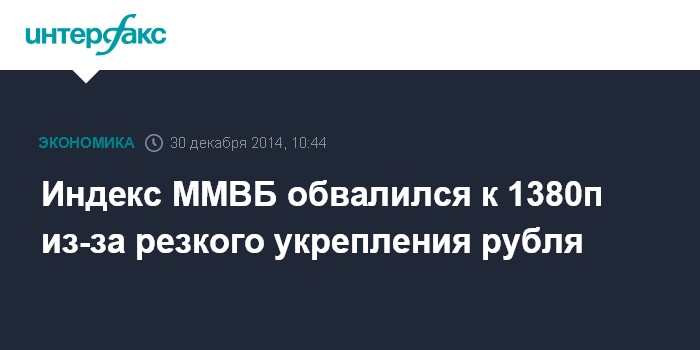 Москва. 30 декабря. INTERFAX.RU - Рублевый индекс ММВБ утром во вторник обвалился в район 1380 пунктов (уровень более чем 2-месячной давности) на фоне резкого укрепления рубля на последних в этом году валютных торгах.